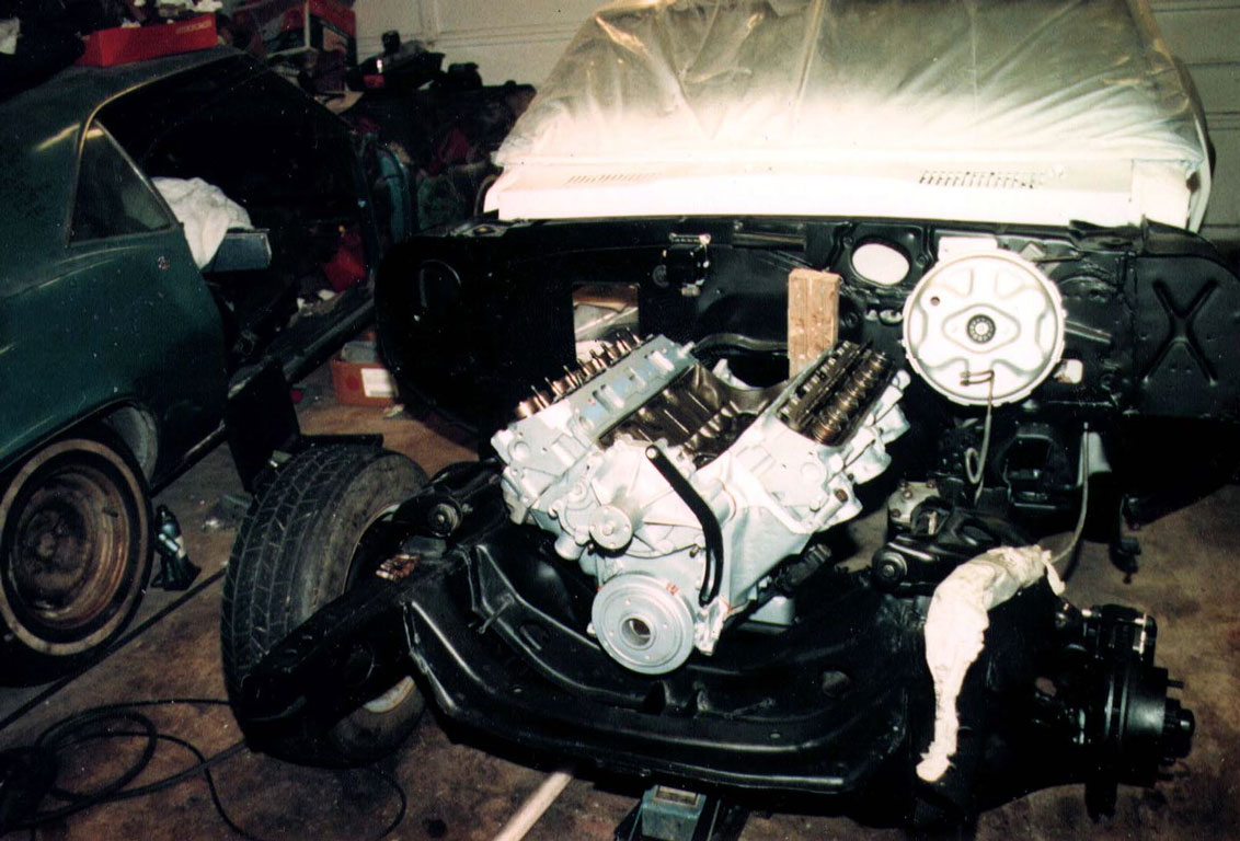 The motor had been rebuilt about 30,000 miles before the accident so it decided not to do a complete rebuild. I cleaned it up, fabricated a custom windage tray, and installed a better oil pump. The engine is a 350 cu. in. Pontiac but feels like a lot more. Most of it's power comes from the factory stock ram air cam was installed with a 4 deg. offset key. Mark was very helpful with this part. With the oil pan on and engine painted, we lifted the motor in place by hand (no engine hoist). We installed the heads next. The heads got a new set of 1:1.65 rocker arms for a little more lift out of the cam. I purchased a set of cast iron ram air exhaust manifolds to keep the stock look and provide more flow. A cast iron intake manifold was used with a Q-jet carburetor. The carb was revamped by RPM speed shop with larger jets and more space in the bowl. Slowly but surely, more pieces were cleaned, painted and installed.