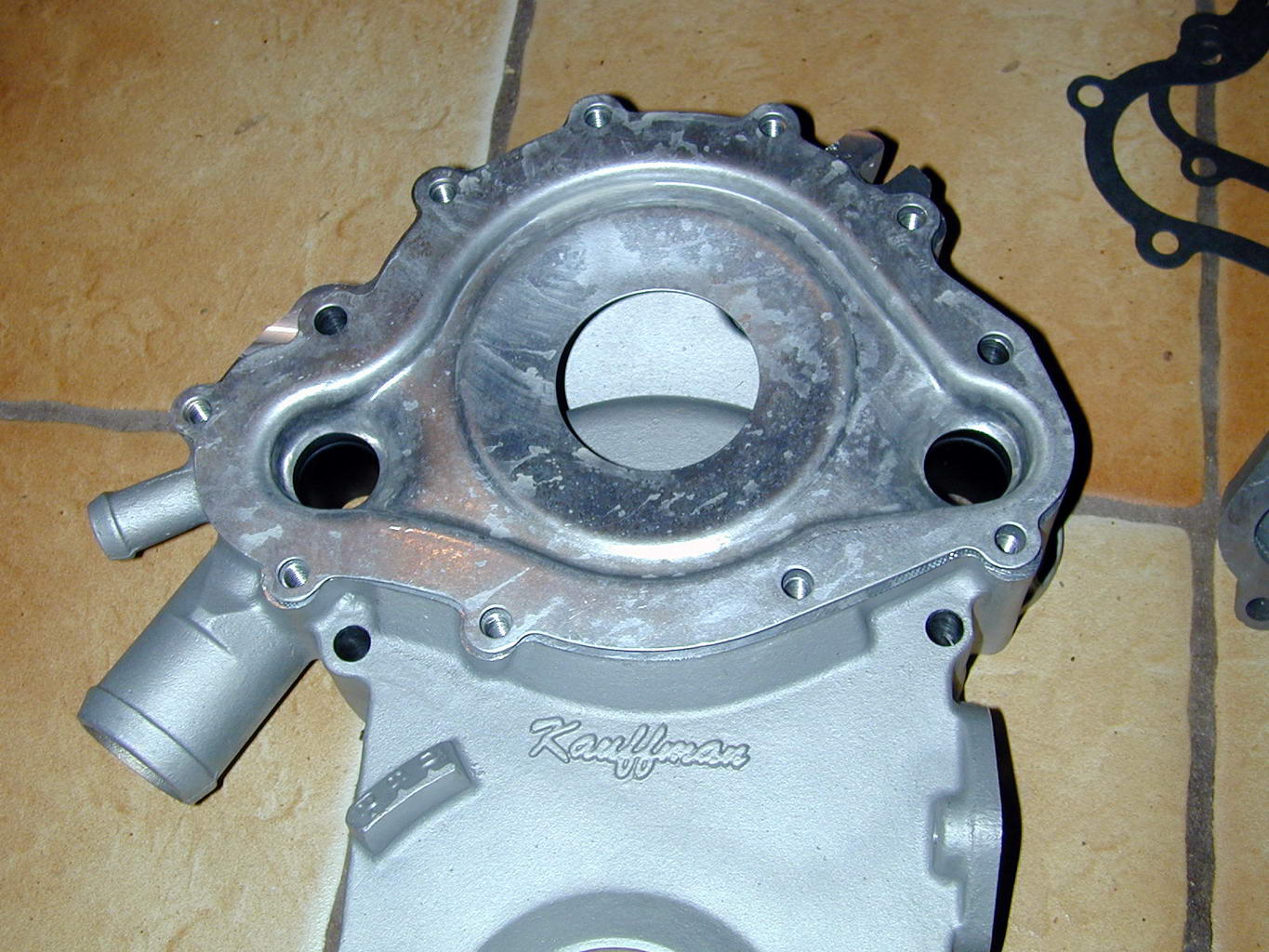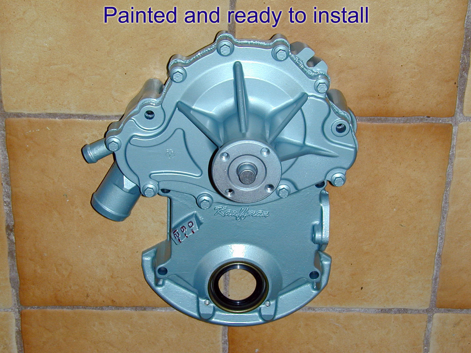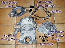 These components should make a good water pump build up. They include the Kauffman Racing timing cover ordered from Tin Indian Performance, Flow Kooler aluminum water pump, ARP bolts, new pump sleeves and gaskets. The KRE Timing Cover came with the front seal. The aluminum casting appears thicker than stock and machining is precisely done. |