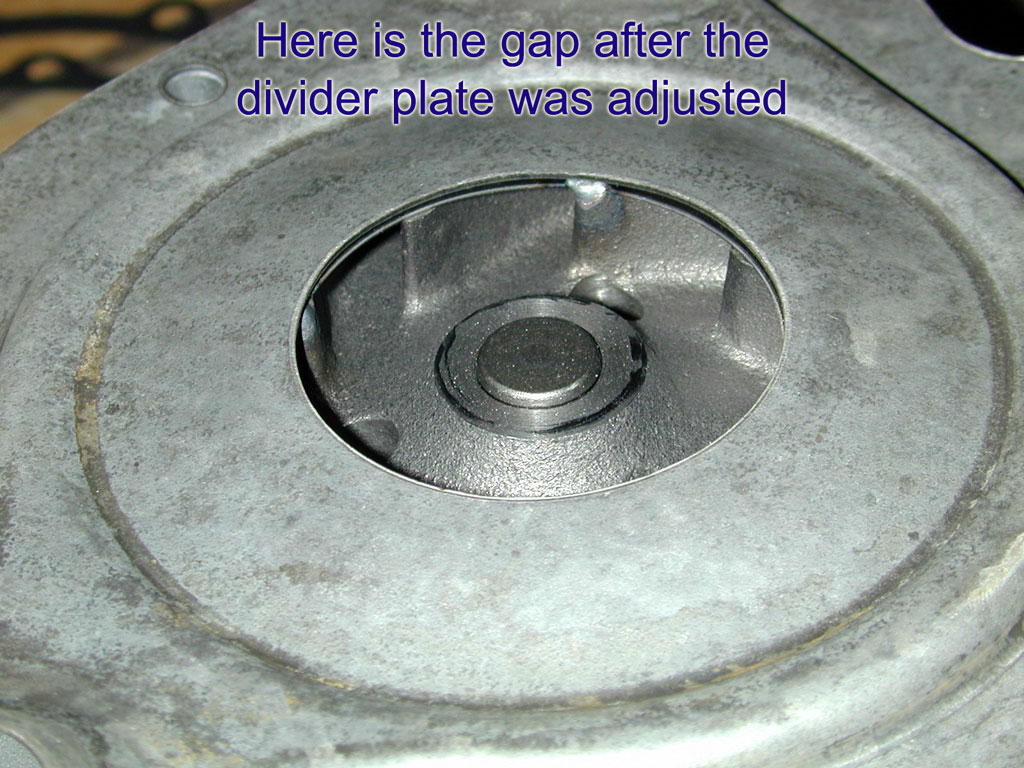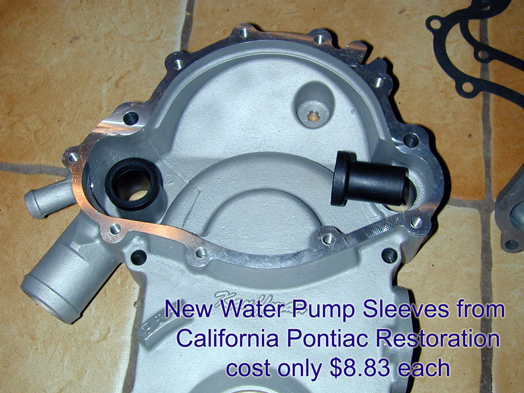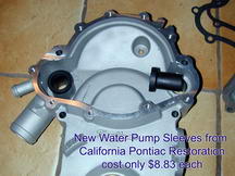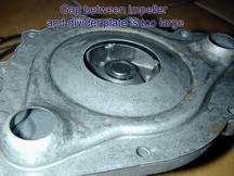 Insert the new sleeves in the timing cover and check the fit of the divider plate. I got my sleeves from California Pontiac Restorations. Next, put the divider plate on the water pump and check the fit. You should have about 0.040-0.060 inches between the impeller and the divider plate. I used a large vise to bend the divider plate and make a tighter fit. |